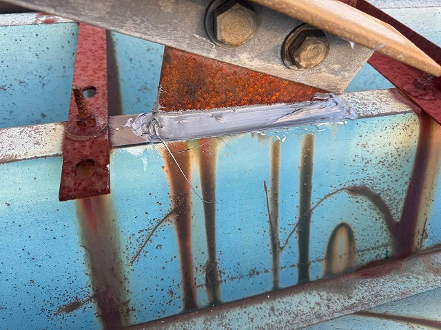 パラペット部以外にも、外壁や折板屋根など、雨水の侵入が懸念される部位へのコーキングの充填を行っています。