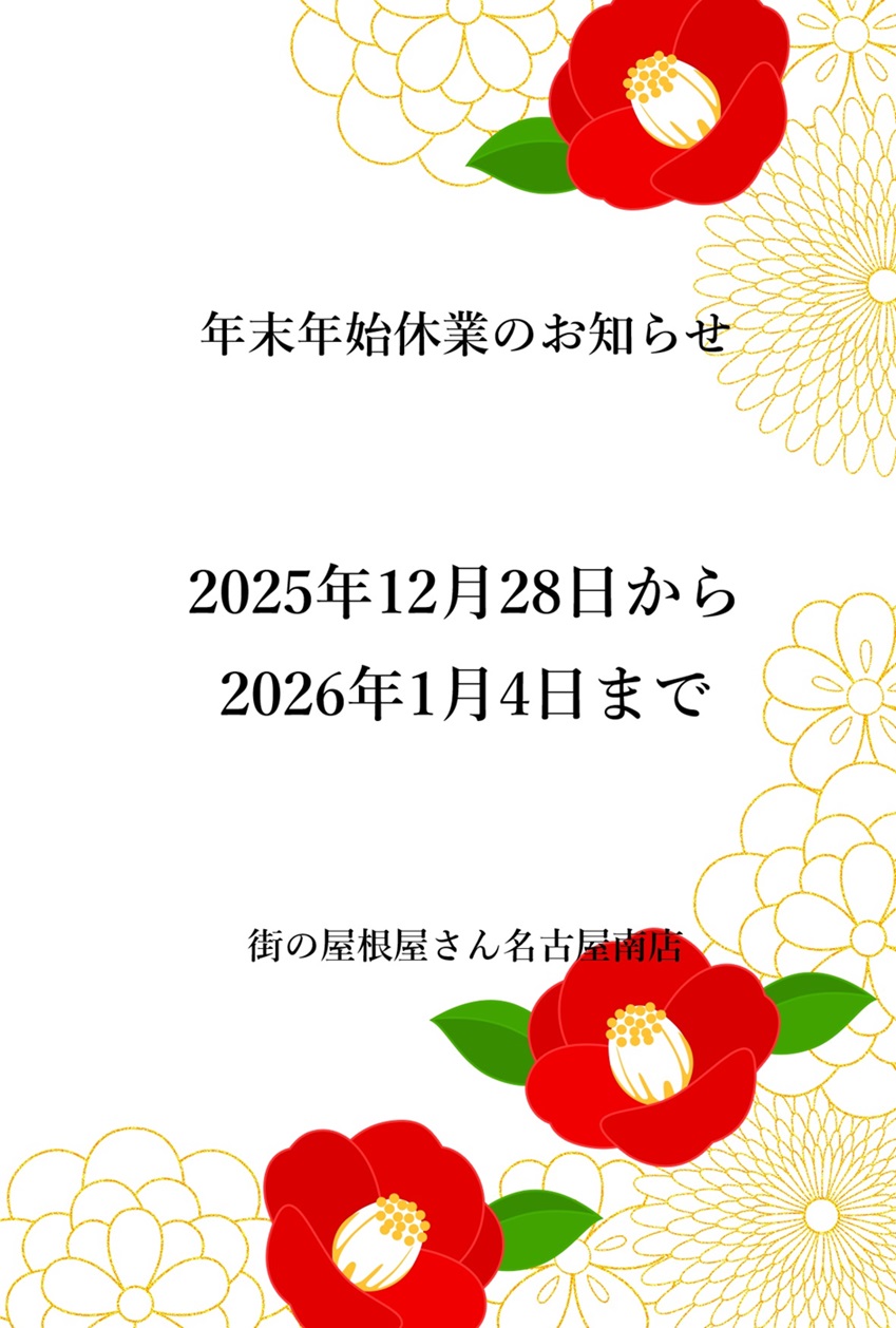 誠に勝手ながら、下記の期間を年末年始休業とさせていただきます。 2025年12月28日(日)〜2026年1月4日(日) 上記期間のメールでのお問い合わせ・点検現地調査のご依頼等は 連休明けからのご対応となりますので、何卒よろしくお願いいたします。 来年も、皆さまの大切なお住まいを守るお手伝いができるよう 誠心誠意努めてまいりますので、どうぞよろしくお願いいたします。